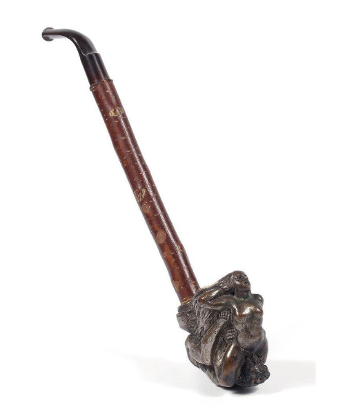 Pipe à fourreau en bronze argenté figurant une scène de cunnilingus acrobatique Travail de l'Europe de l'Est, vers 1900